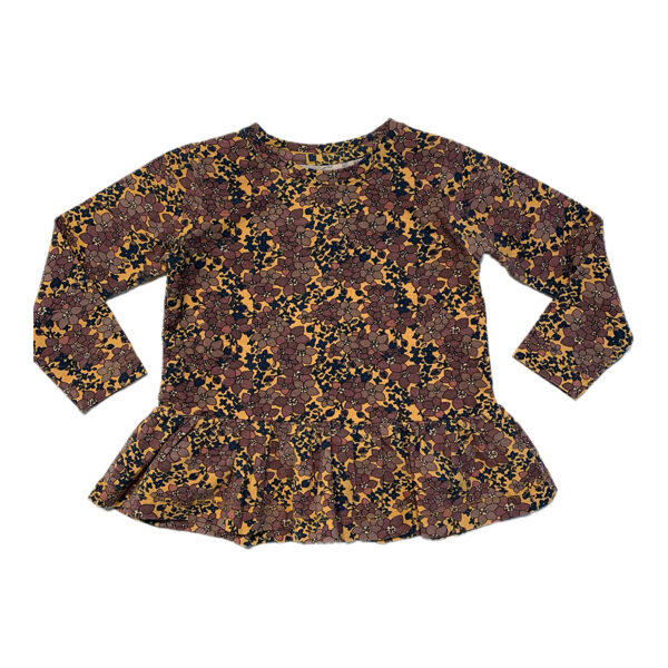 Garroku krekls ar volāniņa apakšu. Skaists ziedu prints uz dzeltena fona.