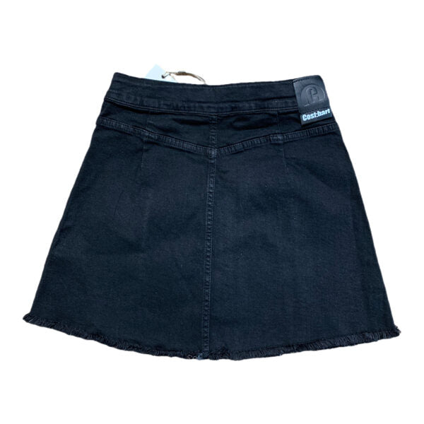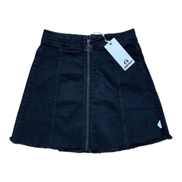Melni džinsa svārki. Priekšpusē rāvējslēdzis, atveras visā garumā. Vidukļa apkārtmērs regulējas.