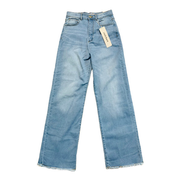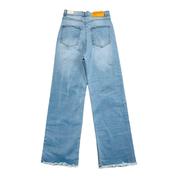 Gaiši zili, plati džinsi ar augstu jostasvietu. Vidukļa platums regulējams. Bikšu galos mazas džinsa bārkstis.