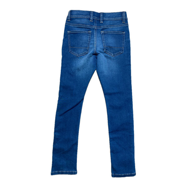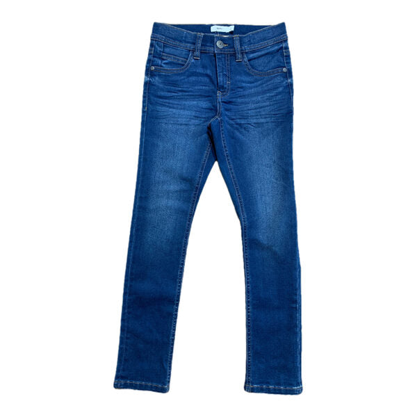 Tumši zili, šauri džinsi. Vidukļa apkārtmērs regulējams.