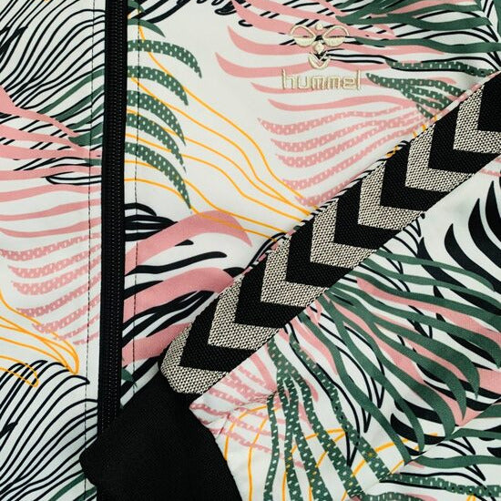 Sportiska stila jaka ar krāsainu printu. Uz rokām spīdīga līnija. Aizveras ar rāvējslēdzi.
