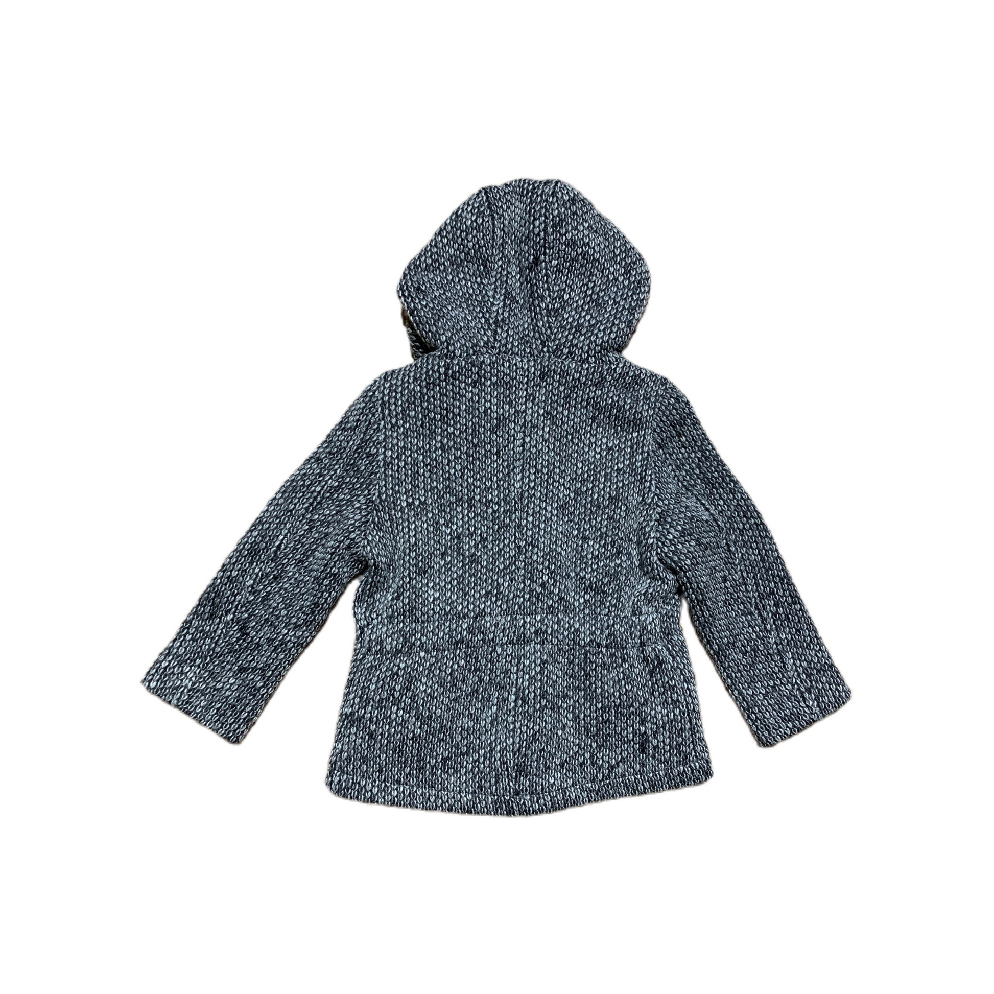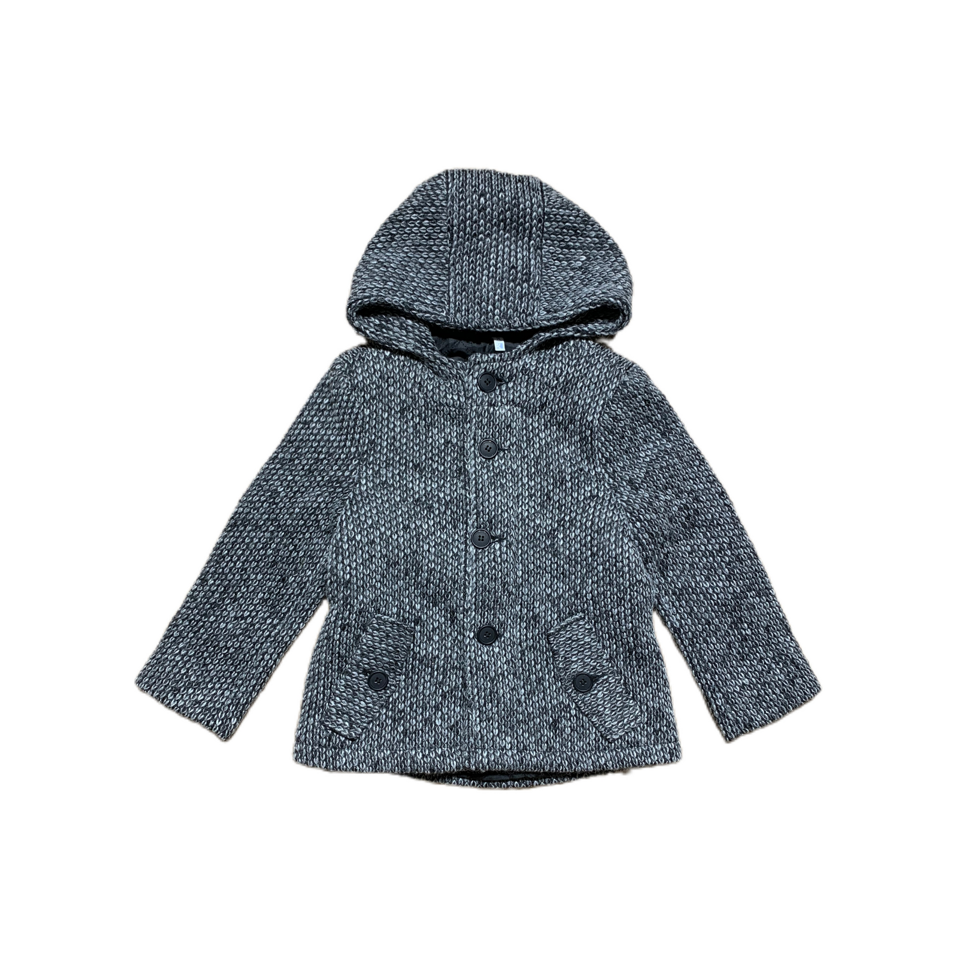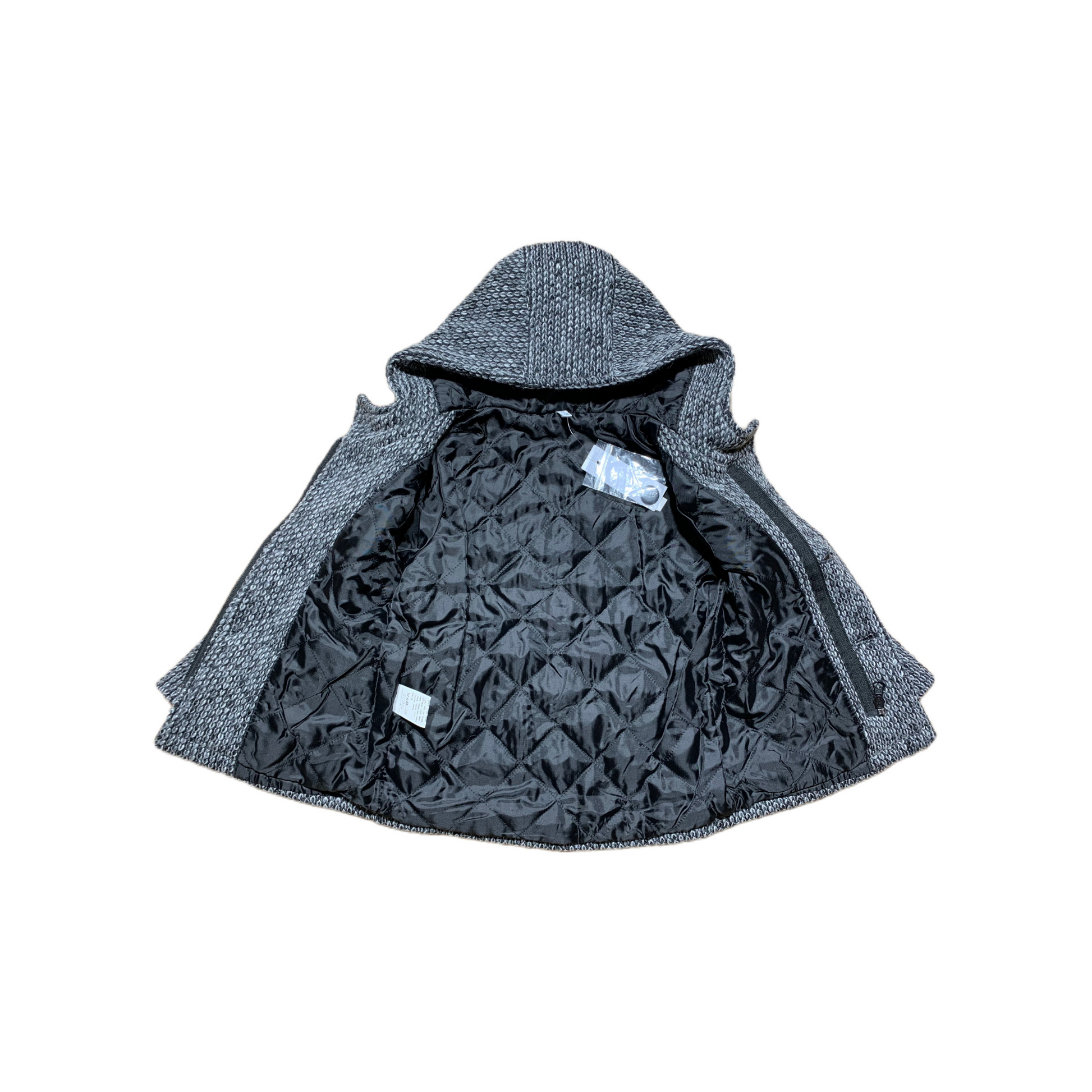 Pelēks ar melnu - vilnas mētelis. Ir siltināts ar vieglu siltinājumu. Priekšā kabatas.