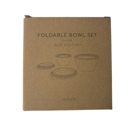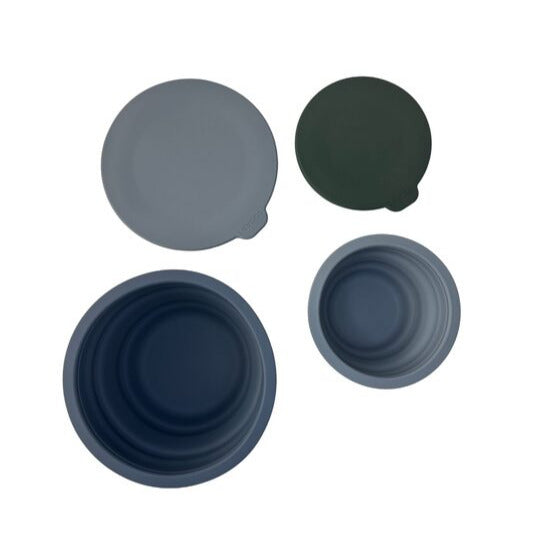 Silikona trauku komplekts zilos, zaļos toņos. Komplektā divas bļodiņas, kuras ir salokāmas uz iekšu. Bļodu vāciņus var izmantot kā šķīvi. Šos traukus var mazgāt trauku mazgājamā mašīnā.