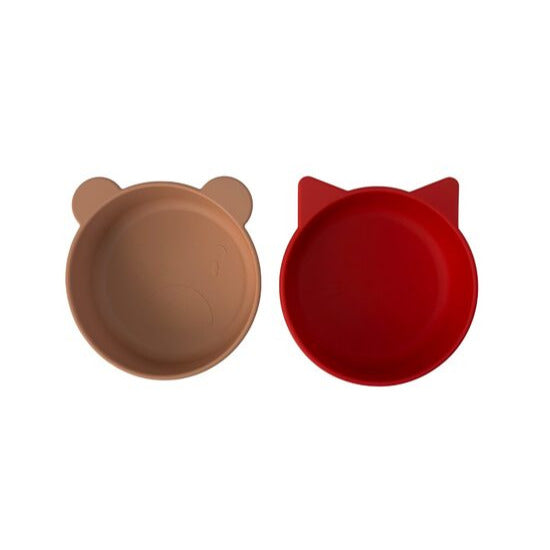 Silikona bļodiņas Apple red&Tuscany rose mix. Bļodiņām ir austiņas un iekšpusē dzīvnieku sejas. Šī komplekta bļodu diametrs ir 15cm, dziļums 4.5cm. Šos traukus var mazgāt trauku mazgājamā mašīnā.