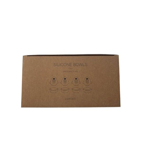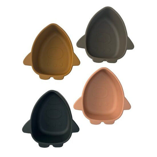 Silikona bļodiņu komplekts Space. Bļodām ir kosmosa raķešu elementi. Bļodu izmēri: 11.5cm x 12cm, dziļums 4.5cm. Šos traukus var mazgāts trauku mazgājamā mašīnā.