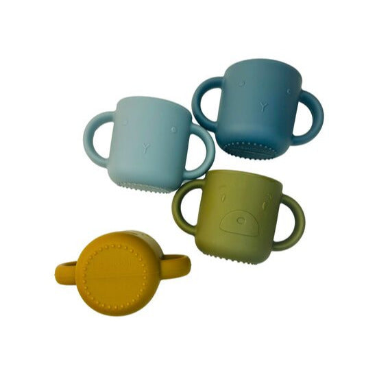Silikona krūžu komplekts, komplektā 4 krūzas dažādās krāsās. Abos sānos osiņas ērtam satvērienam. Krūzes priekšpusē sejiņas. Tilpums 160ml. Var mazgāt trauku mazgājamā mašīnā.
