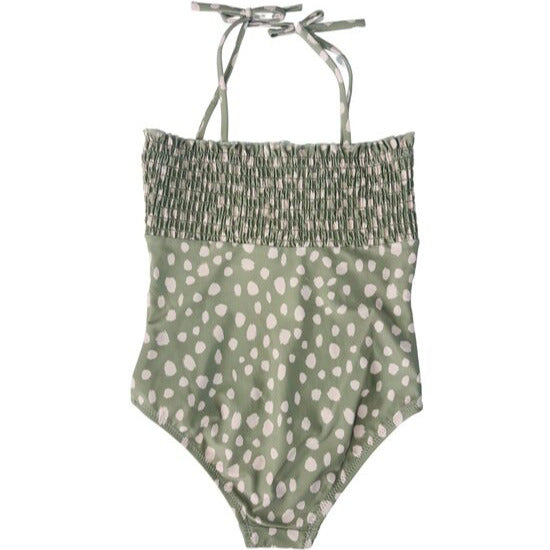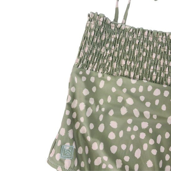 Pasteļzaļš peldkostīms ar bēšu printu. Augšdaļa ar dekoratīvu savilkumu, plecu lences sasienamas - regulējamas. Ir odere.