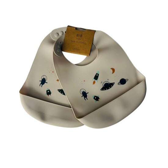 Silikona priekšauti - 2 priekšautu komplekts. Ir kabatiņa, kas palīdz ēdienam nenokļūt tālāk par priekšautu. Kakla daļas platums regulējams. Kosmosa prints.