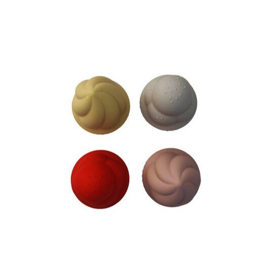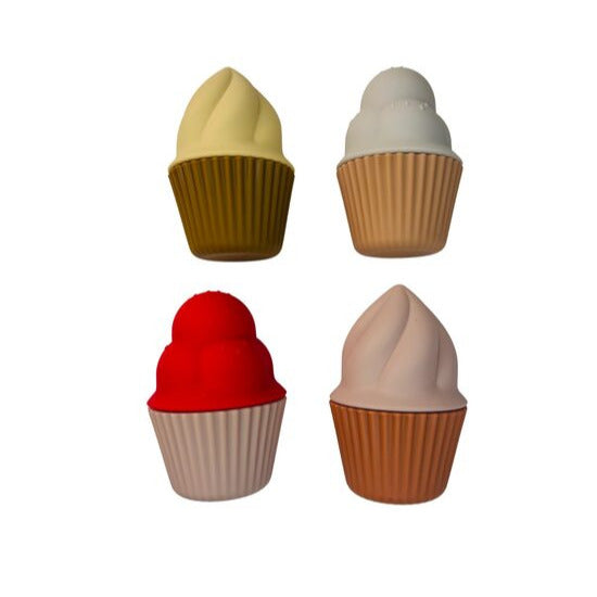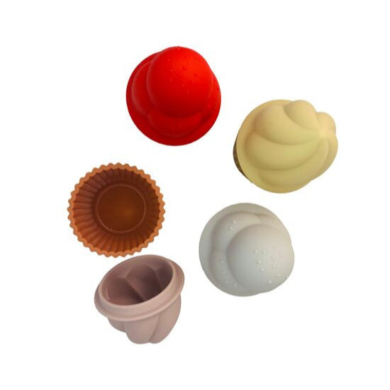 Silikona rotaļlietu komplekts - keksiņi. Keksiņu augšdaļa atvienojama no apakšas. 4 krēmu veidi. Keksiņš apmēram 8.5cm augsts.