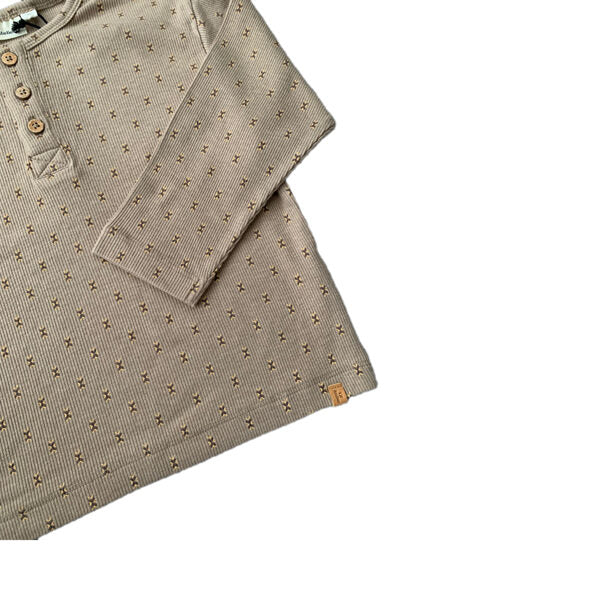 Gaiši brūns garroku krekls ar printu, ribbed audums. Priekšpusē trīs pogas. Audums ļoti maigs uz tausti.
