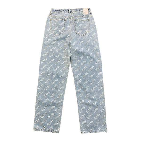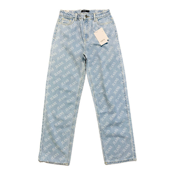 Gaiši zili džinsi ar uzrakstu printu. Vidukļa apkārtmērs regulējams.