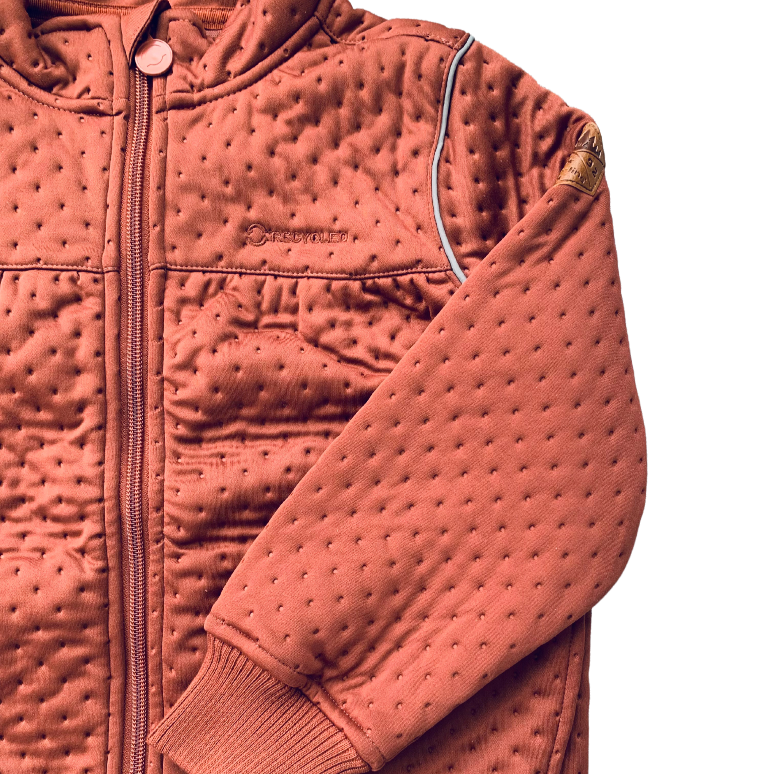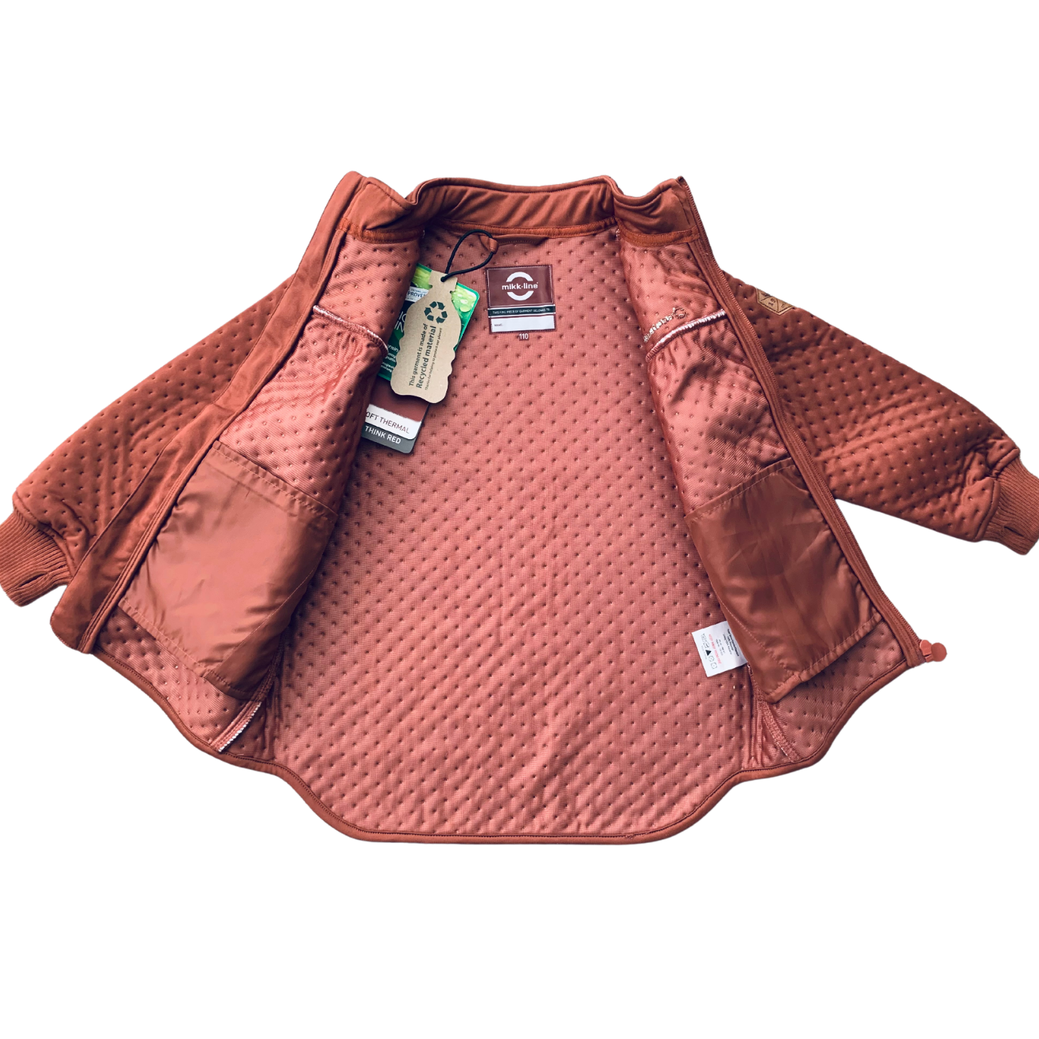 Sarkanbrūna soft-termo jaka. Vēja un mitruma necaurlaidīga. Maigs, mīksts audums, muguras daļa pagarināta. Notur ķermeņa siltumu iekšpusē. Kombinējot ar apakškārtu, velkama pie dažādas temperatūras amplitūdas.