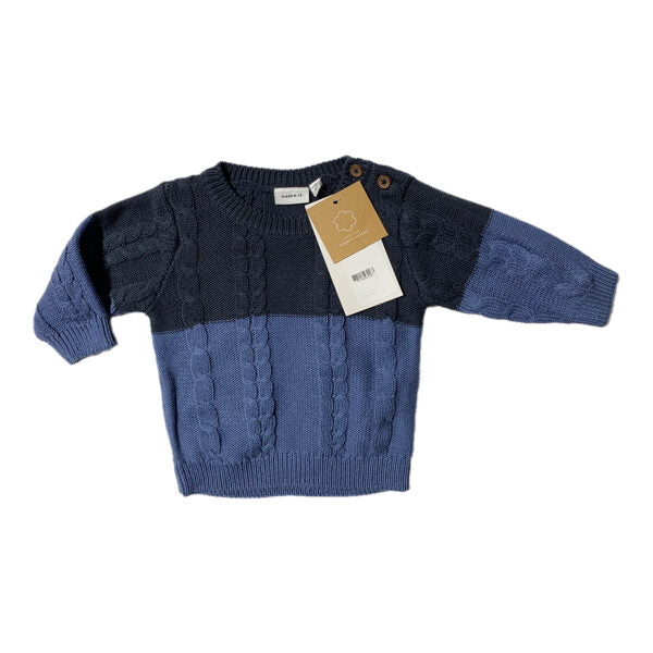 Adīts mazuļu džemperis ar pīnes rakstu, divkrāsains. Pleca daļā divas pogājamas pogas ērtākai ģērbšanai.