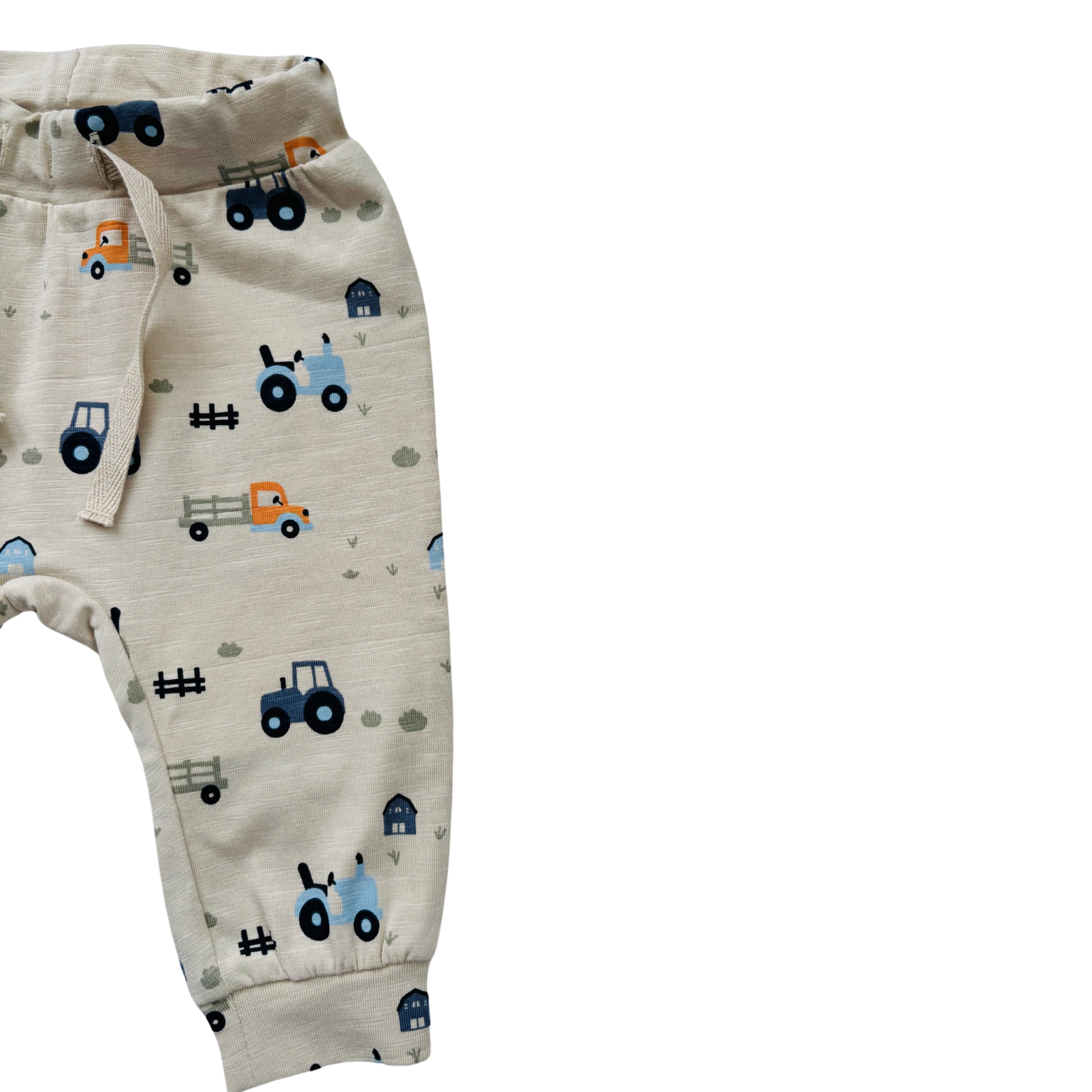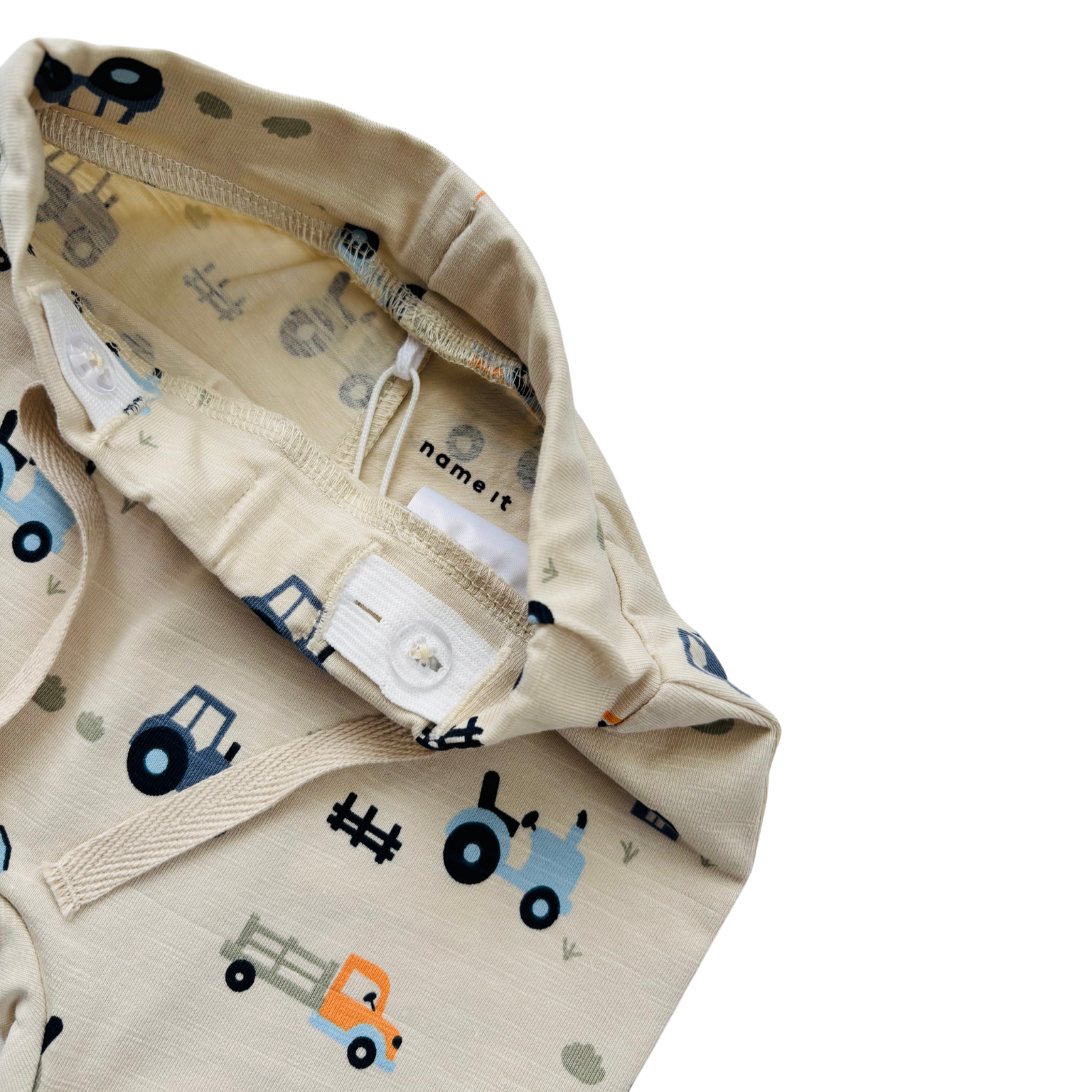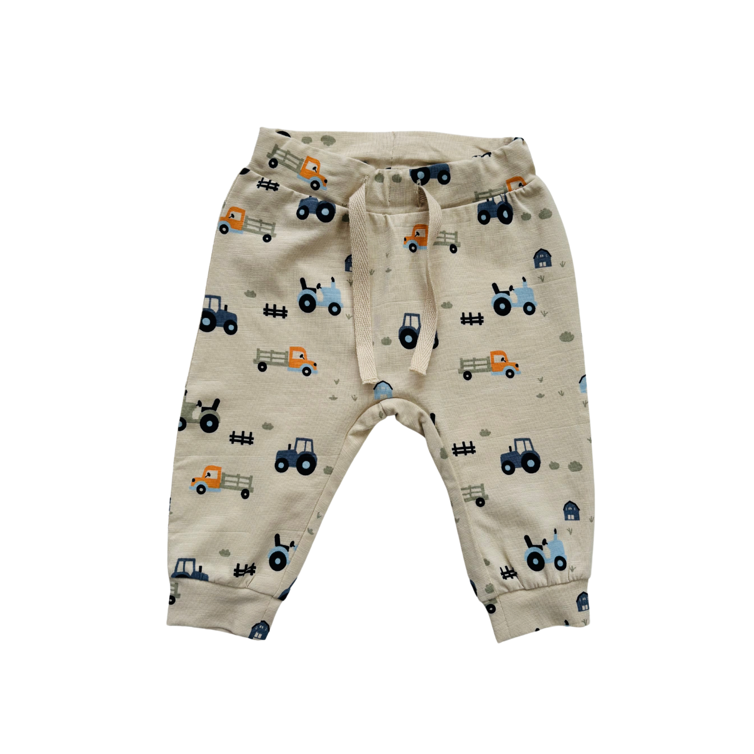 Bēšas bikses ar auto un traktoru printu. Viduklis regulējams ar pogām un gumiju jostām. Brīvs piegriezums.