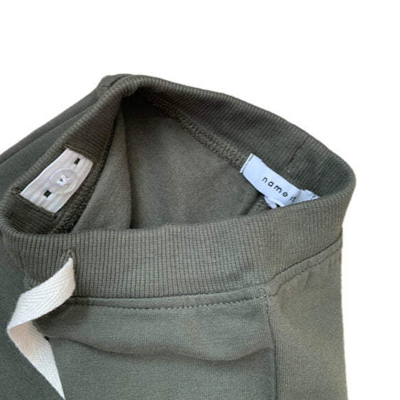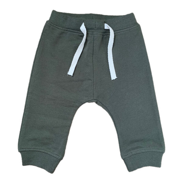 Haki krāsas mazuļu biezās bikses. Iekspuse siltināta ar kokvilnas flīsa siltinājumu. Viduklis regulējams ar gumiju.