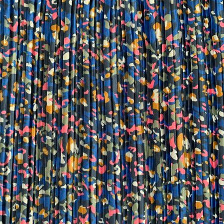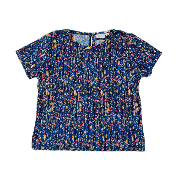 Plisēta auduma blūze ar raibu printu. Mazliet plata, taisna piegriezuma.