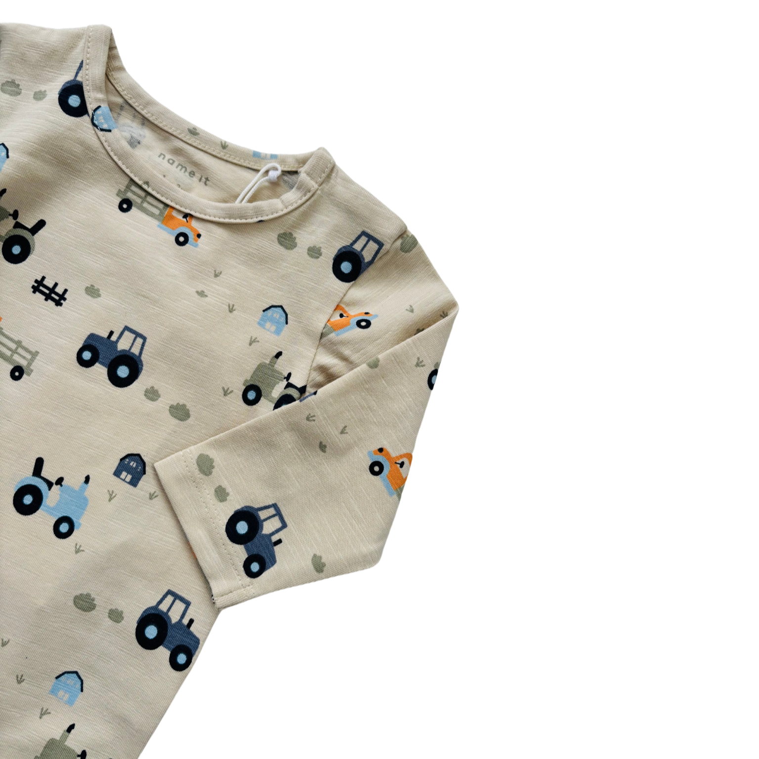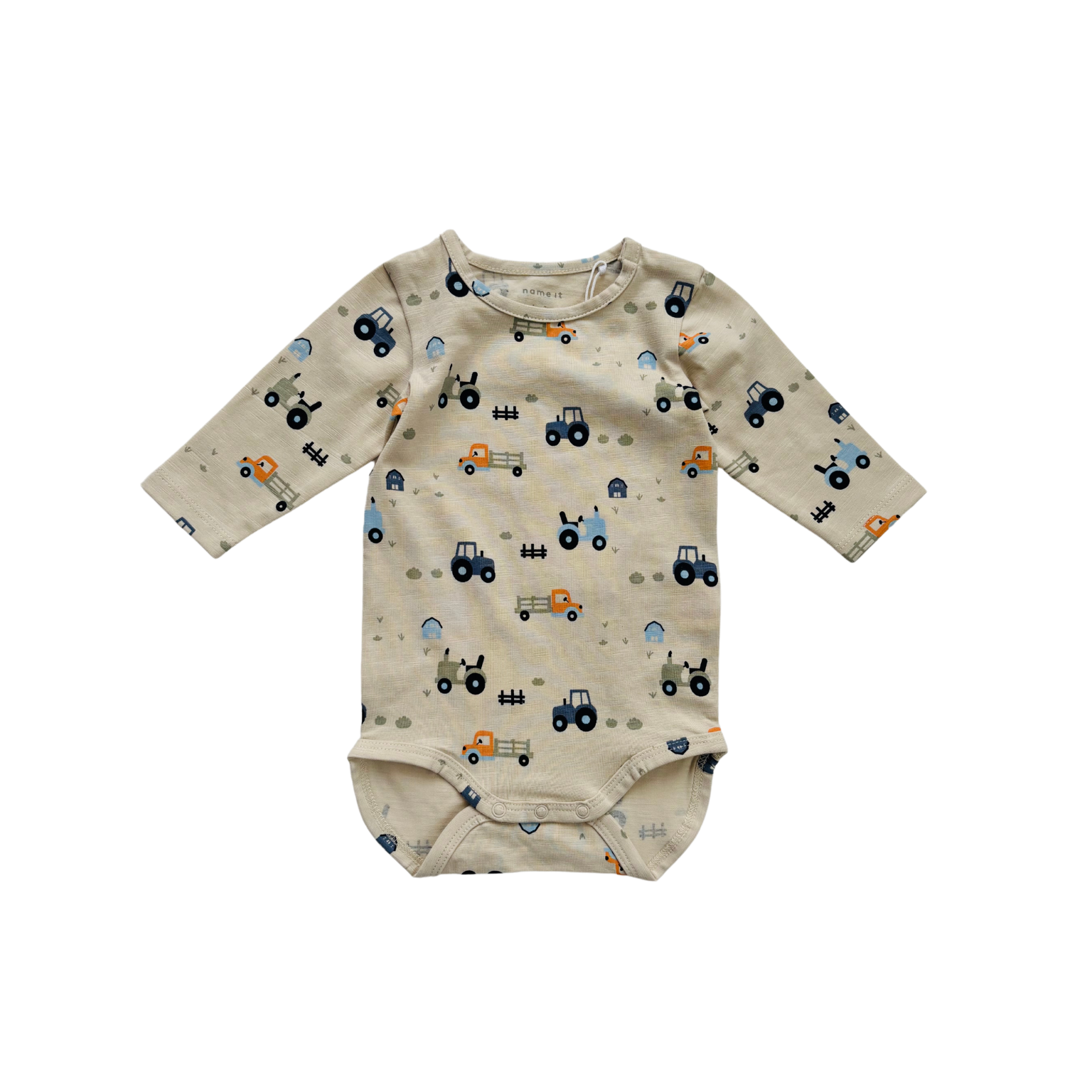 Bēšas krāsas bodijs ar auto un traktoru printu.