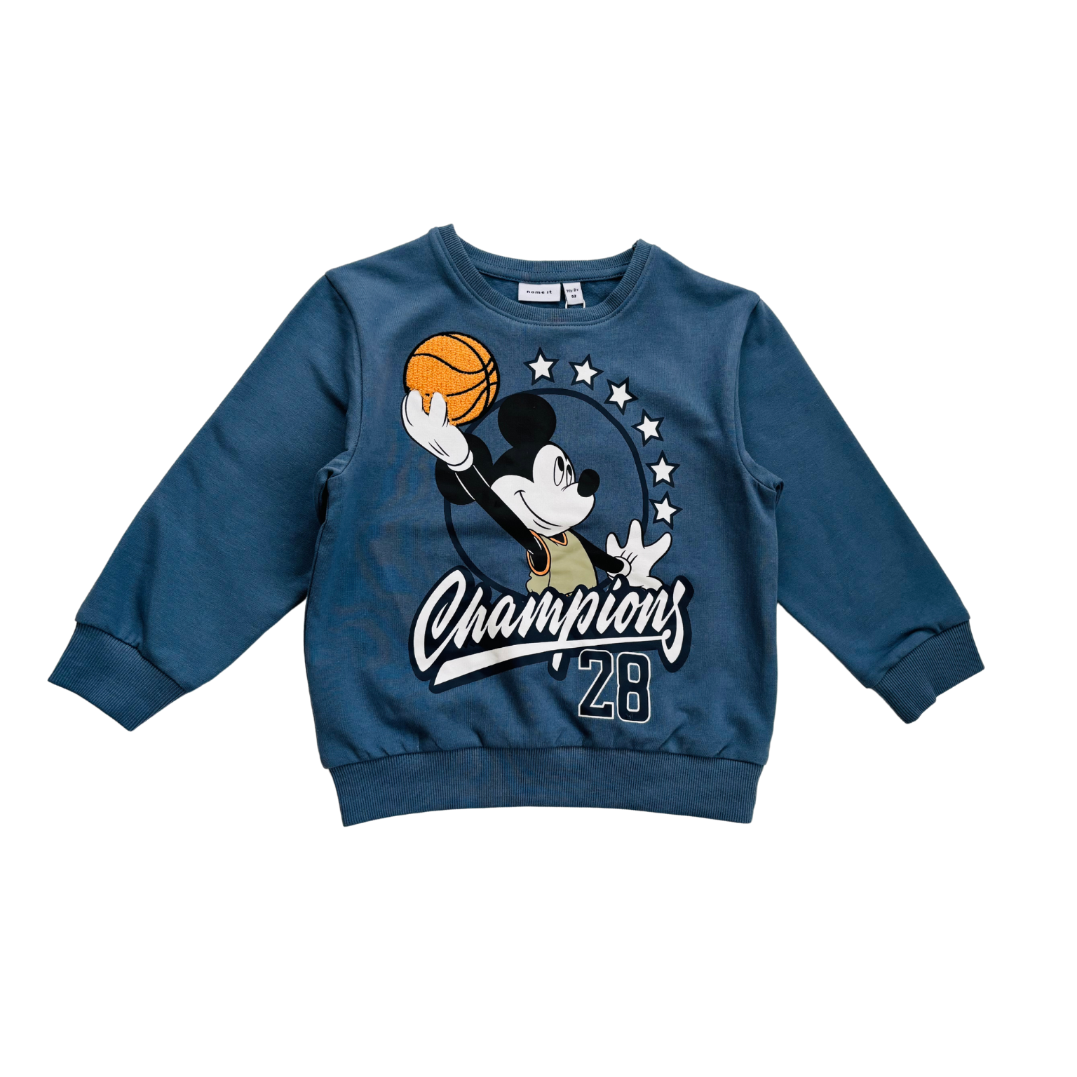 Zils džemperis ar Mickey printu, basketbola bumbas izšūta aplikācija. Mīksts siltinājums (brushed inside), bet džemperis nav biezs.