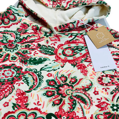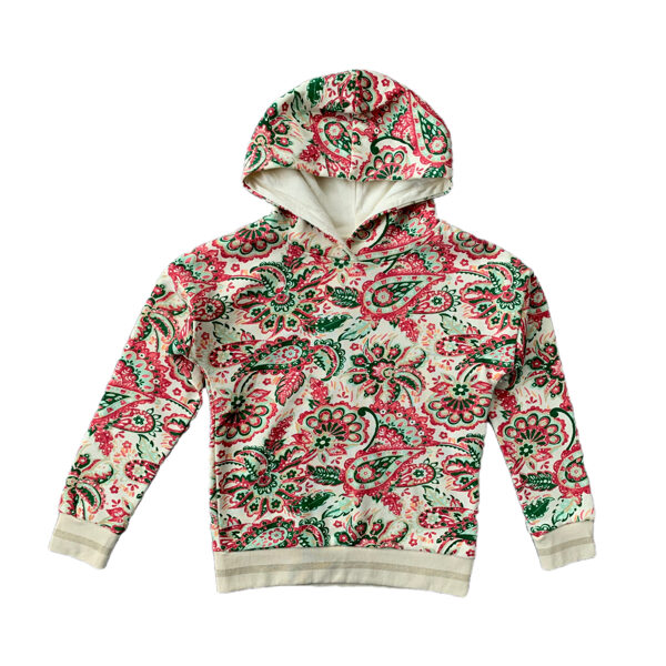 Krēmkrāsas hūdijs ar košu, raibu printu. Iekšpusē mīksts flīsa siltinājums.