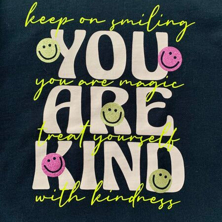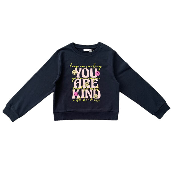 Tumši zils džemperis, krāsains prints ar uzrakstu. Nav siltināts.