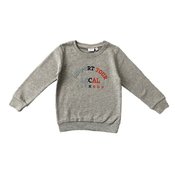 Pelēks Name it džemperis ar izšūtu uzrakstu. Iekšpusē kokvilnas flīsa siltinājums (brushed inside).