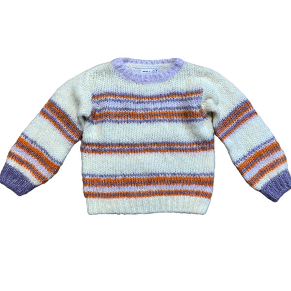 Krēmkrāsas adīts džemperis ar oranžām, violetām strīpām. Adījums ļoti maigs uz tausti.