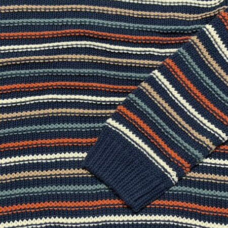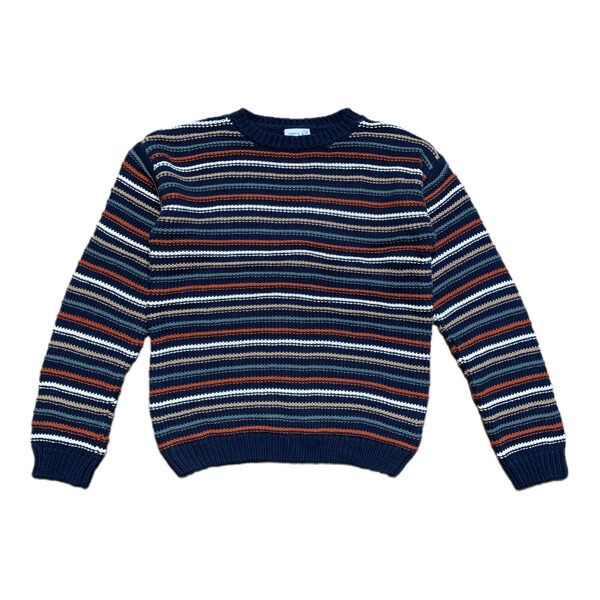 Adīts, tumši zils Name it džemperis ar krāsainu strīpu rakstu. Vidēji biezs adījums. Brīvs piegriezums, plats.