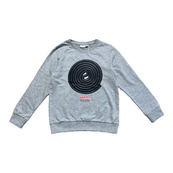 Pelēks Name it džemperis ar Haribo printu. Iekšpusē mīksts kokvilnas flīsa siltinājums (brushed inside).