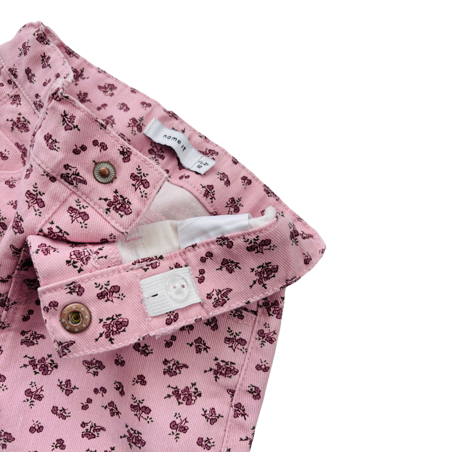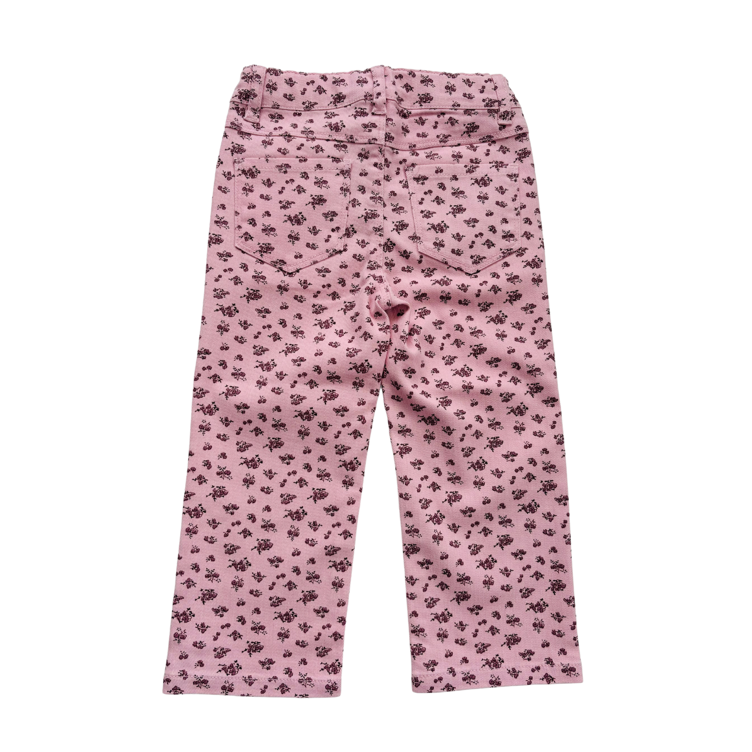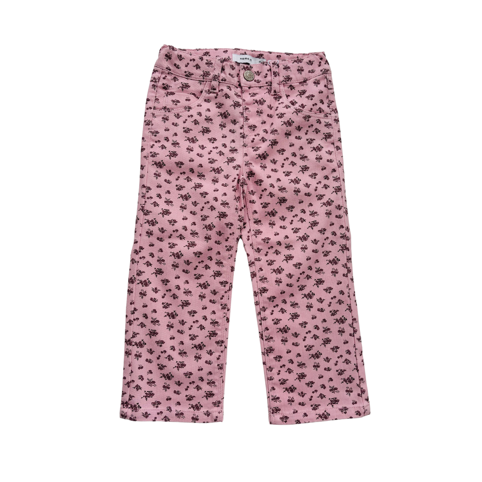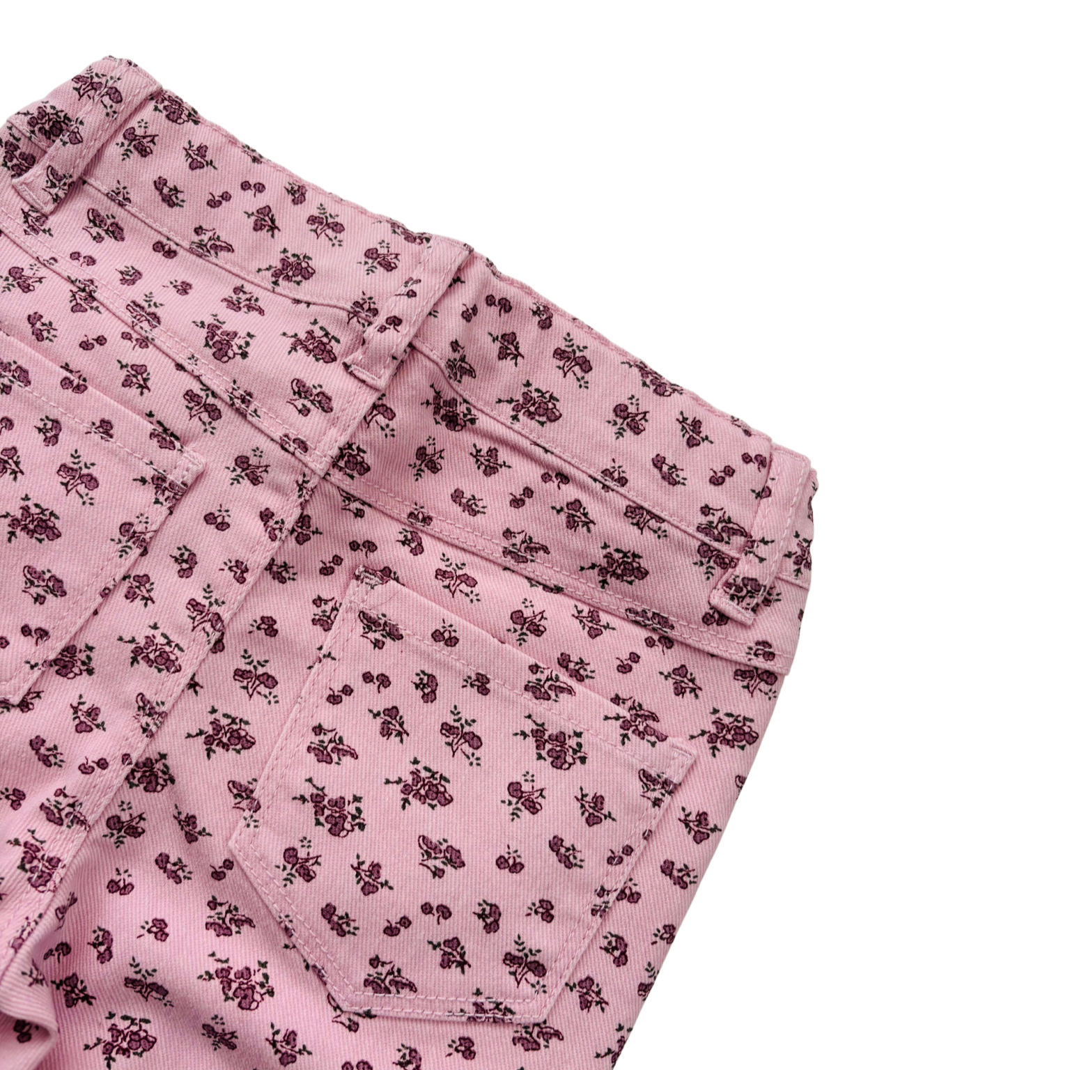 Rozā džinsi, taisni - ar smalku ziediņu printu. Viduklī spiedpoga, lai viegli atvērt/aizvērt. Viduklis regulējams ar pogām un gumiju jostā.