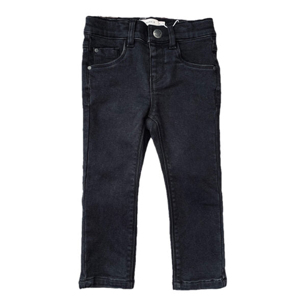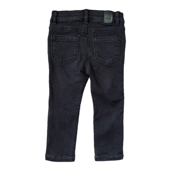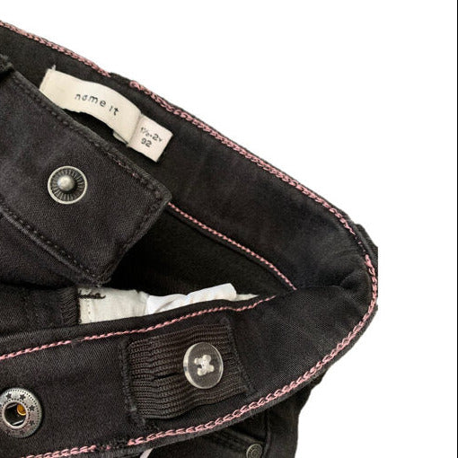 Melni, šauri džinsi. Pogājas ar spiedpogu, viduklis regulējas ar gumiju un pogām.