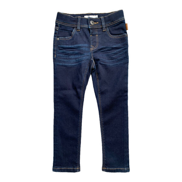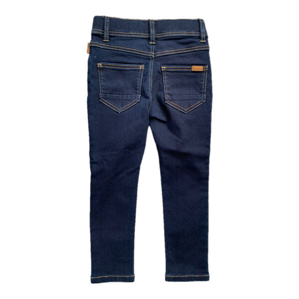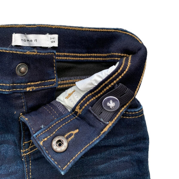 Tumši zili meiteņu džinsi. Šauri. Pogājas ar spiedpogu. Viduklis regulējams ar gumiju un pogām.