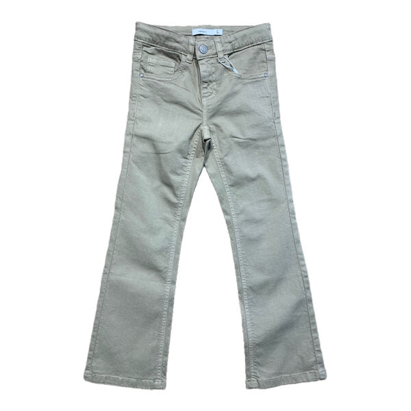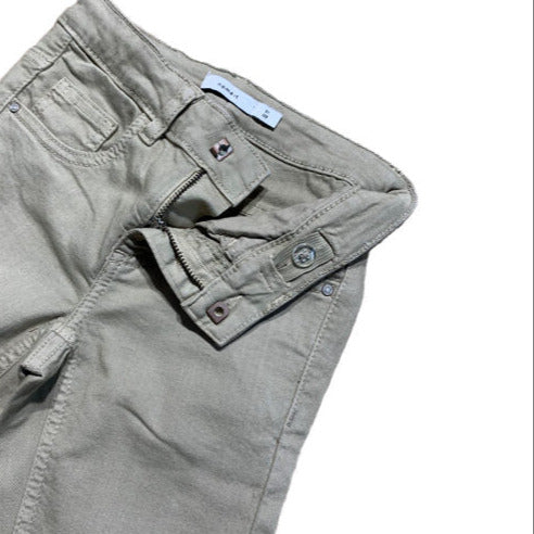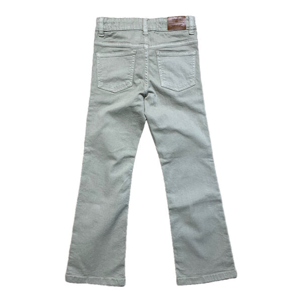 Gaiši brūni džinsi ar paplatinātiem galiem. Vidukļa apkārtmērs regulējams. Poga ar āķa aizdari.