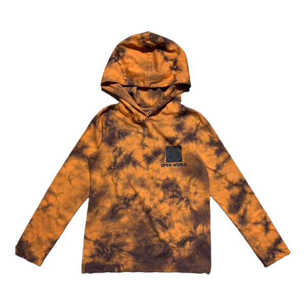 Name it garroku krekls oranžs ar tumšu batikojuma krāsojumu. Kreklam ir kapuce.