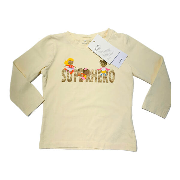 Gaiši dzeltens garroku krekls ar zeltaini spīdīgu uzrakstu, meiteņu apdruku.