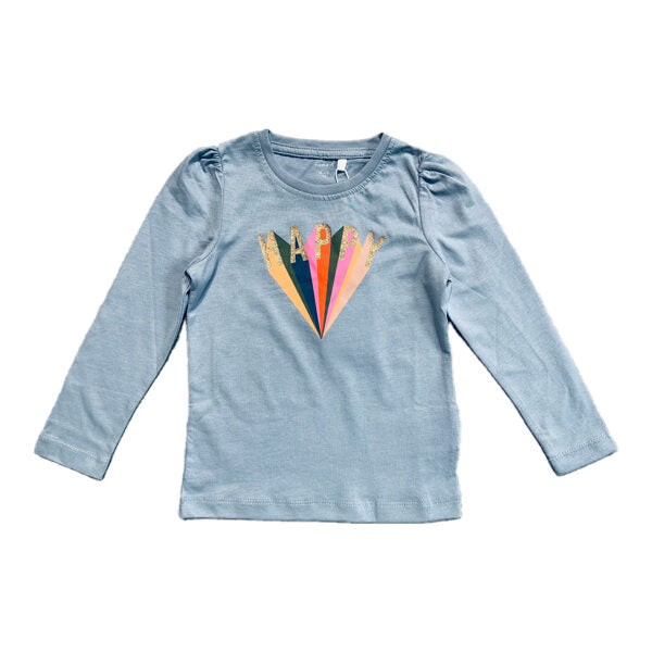 Gaiši zils garroku krekls ar krāsainu printu un spīdīgu uzrakstu.