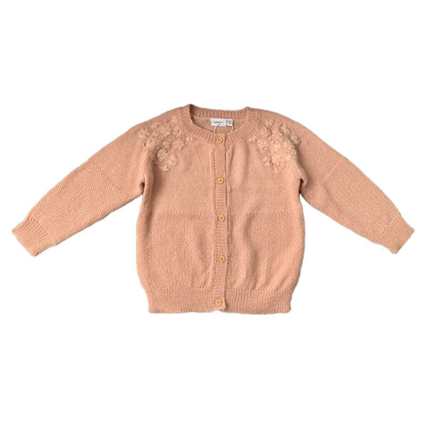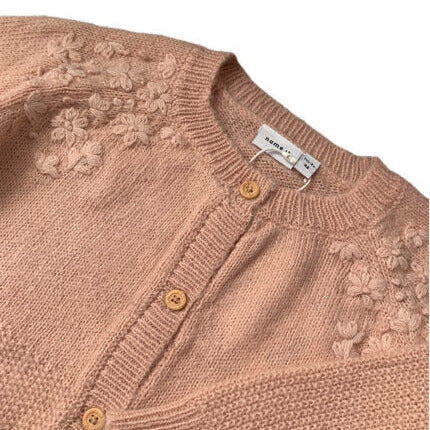 Maigi rozā plāna adījuma jaka ar izšūtiem ziediņiem pie pleciem. Jaka maiga uz tausti.