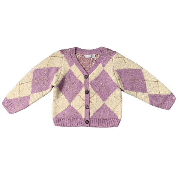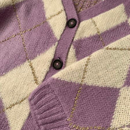 Vidēji bieza adījuma jaka ar rombu rakstu. Gaiši violeti un krēmkrāsas toņi, zeltīts diedziņš veido rakstu.