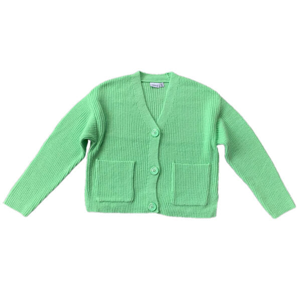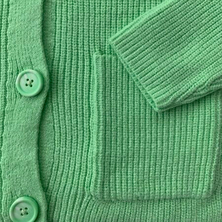 Gaiši zaļa oversize jaka ar pogām. Uz tausti ļoti maigs adījums. Priekšpusē divas kabatas.