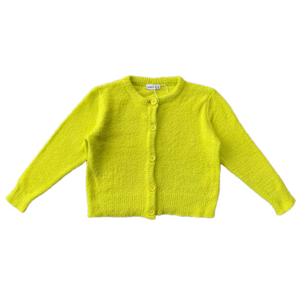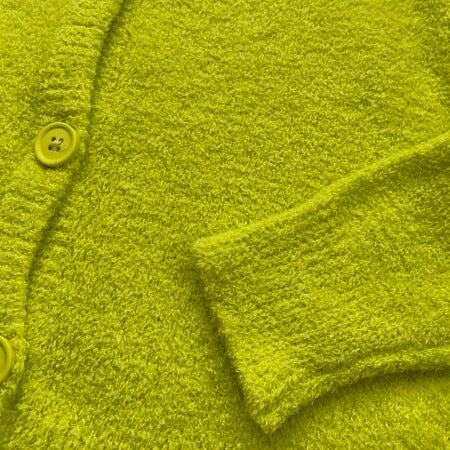 Neon-dzeltena adīta jaka. Ļoti mīksta, "pūkainu" virsmu.