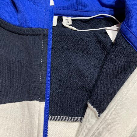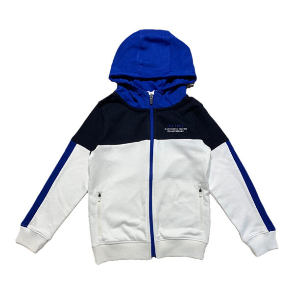 Name it jaka ar rāvējslēdzi, kapuci. Balta, zila, melna krāsa. Mazs uzrakstu prints priekšpusē. Priekšpusē ir kabatas.
