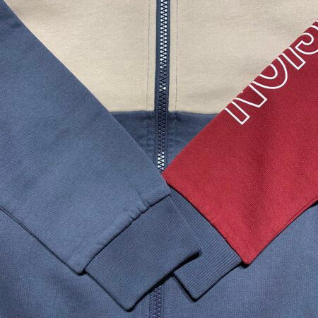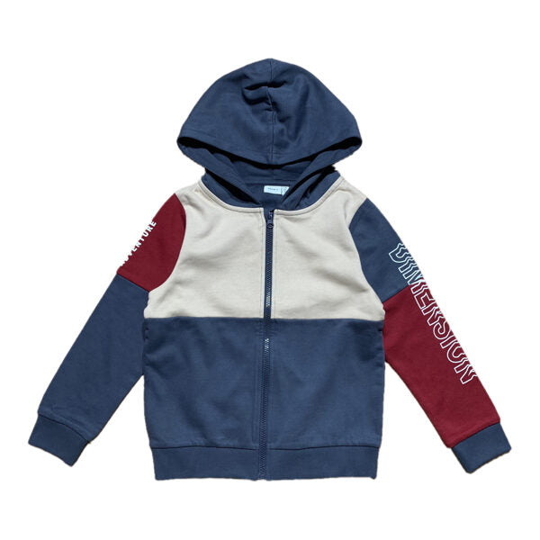 Name it jaka ar rāvējslēdzi un kapuci. Pelēkzila ar bēšu un bordo sarkanu. Iekšpusē mīksts kokvilnas flīsa siltinājums (brushed inside).