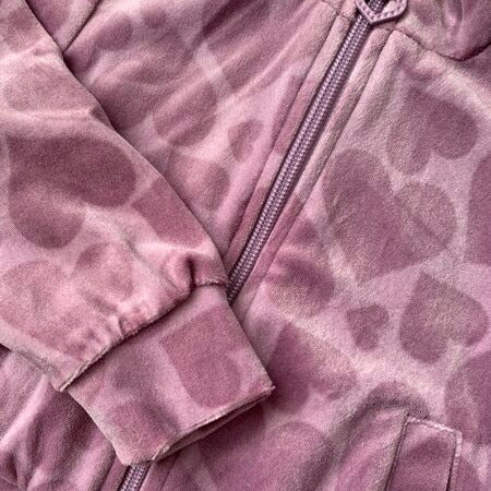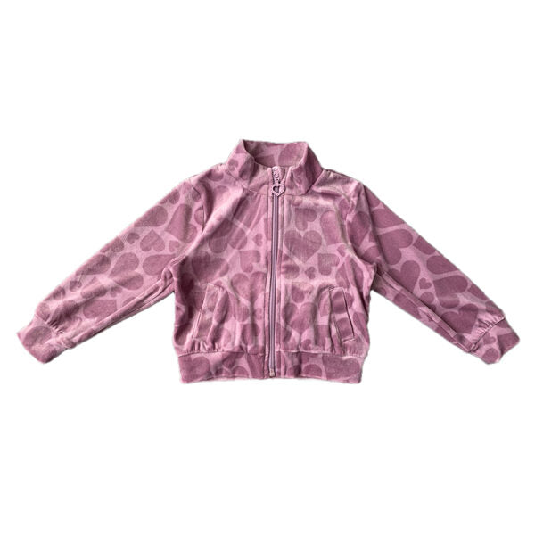 Mīksta velūra auduma jaka ar rāvējslēdzi. Violeta krāsa, sirsniņu apdruka. Jaka skaitās saīsināta, jeb crop garuma.