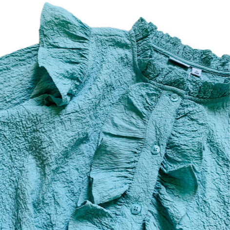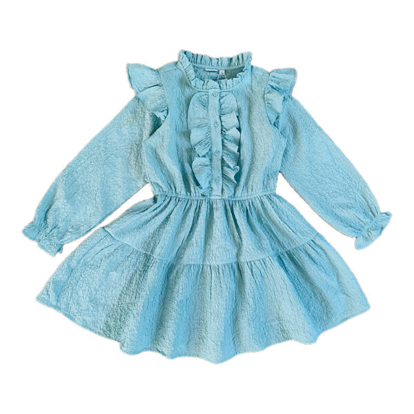 Mint krāsas kleita ar volāniem. Viduklī gumija. Priekšpusē pogas. Svārku daļa kupla. Audums ar "burzītu" struktūru.