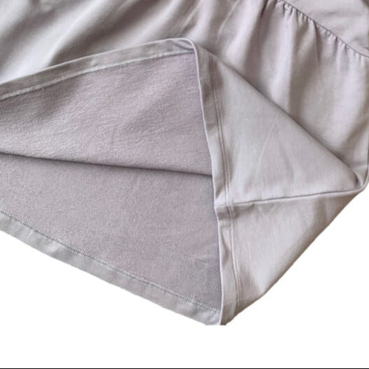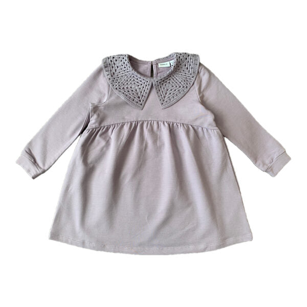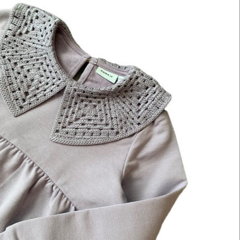 Gaiši violeta džērsija auduma kleita ar tamborētu mežģīnes apkaklīti.