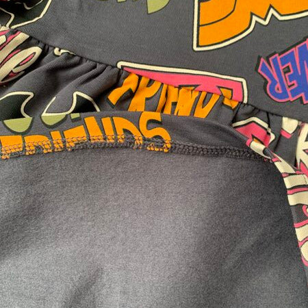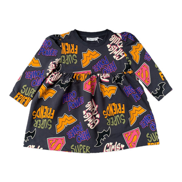 Tumši pelēka džemperkleita ar košu printu. Kleitas iekšpusē mīksts kokvilnas flīsa siltinājums.