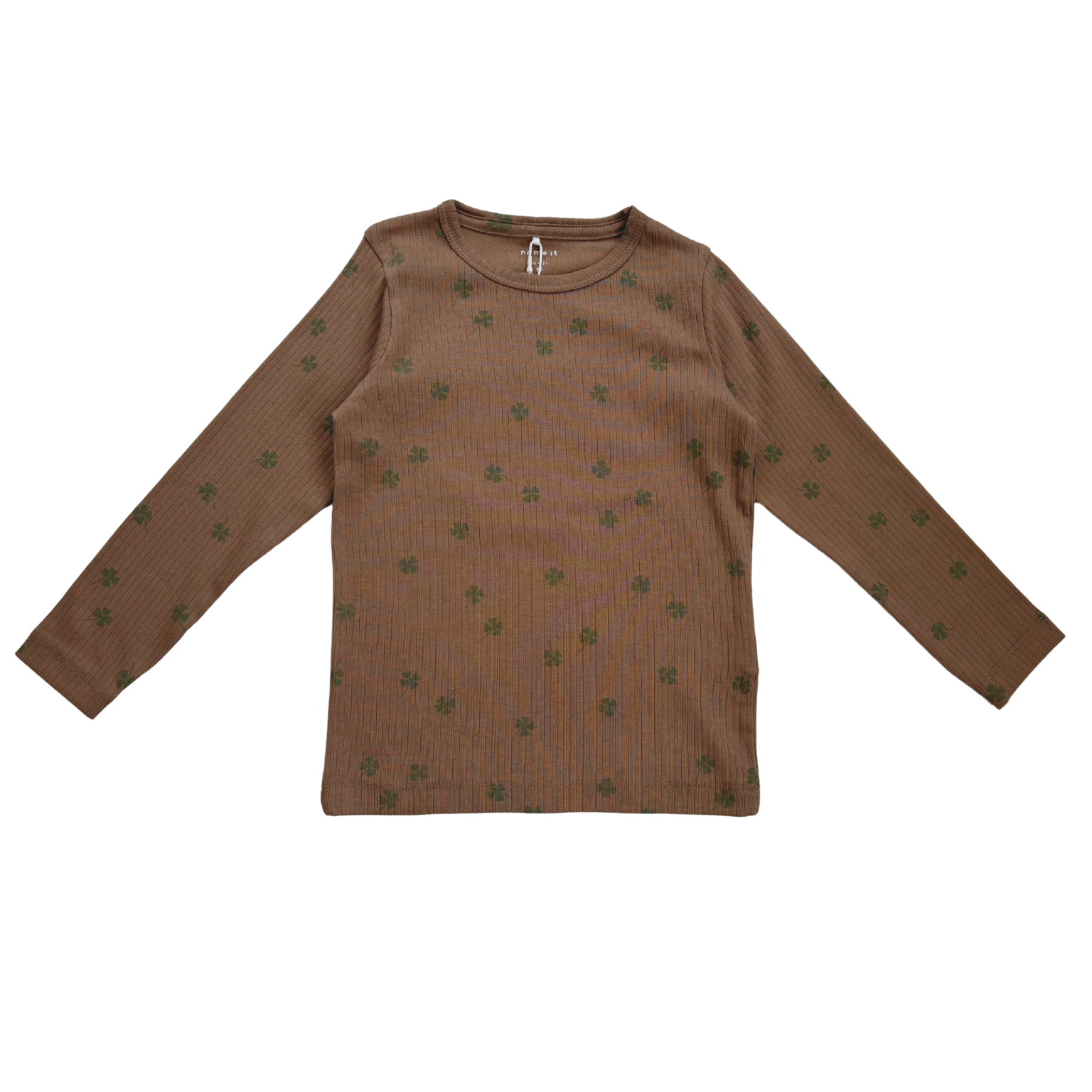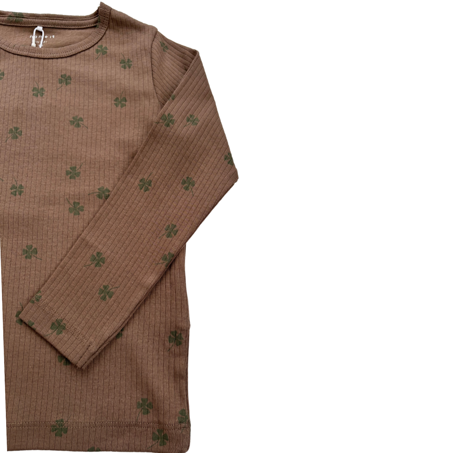 Maigi brūns garroku krekls, ribbed audums. Āboliņlapu prints.