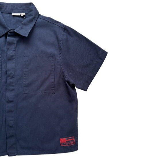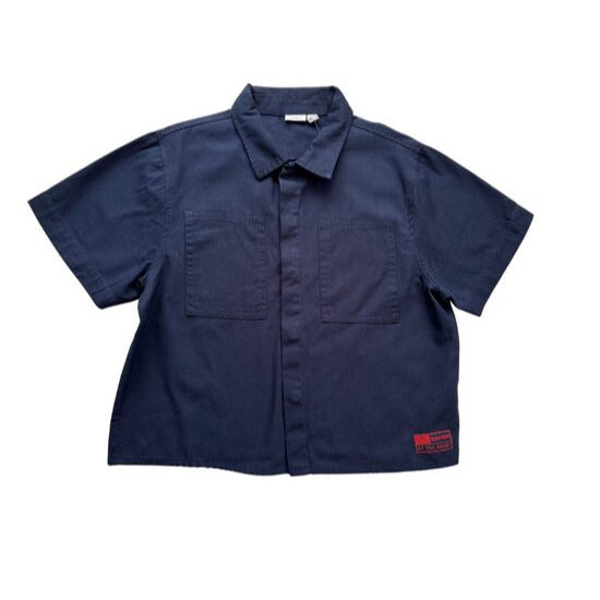 Tumši zils kokvilnas krekls ar spiedpogām, brīvs piegriezums - mazliet oversize.