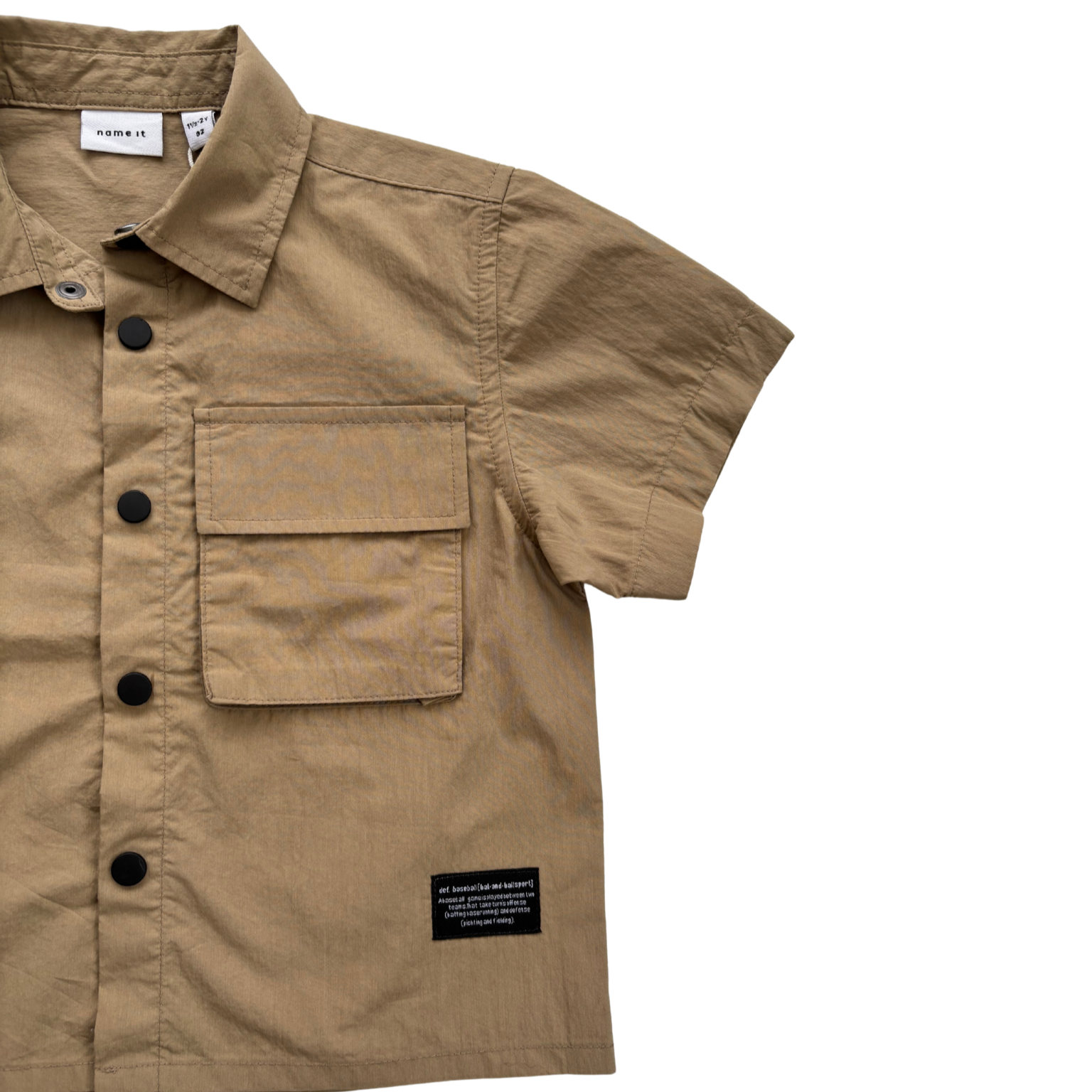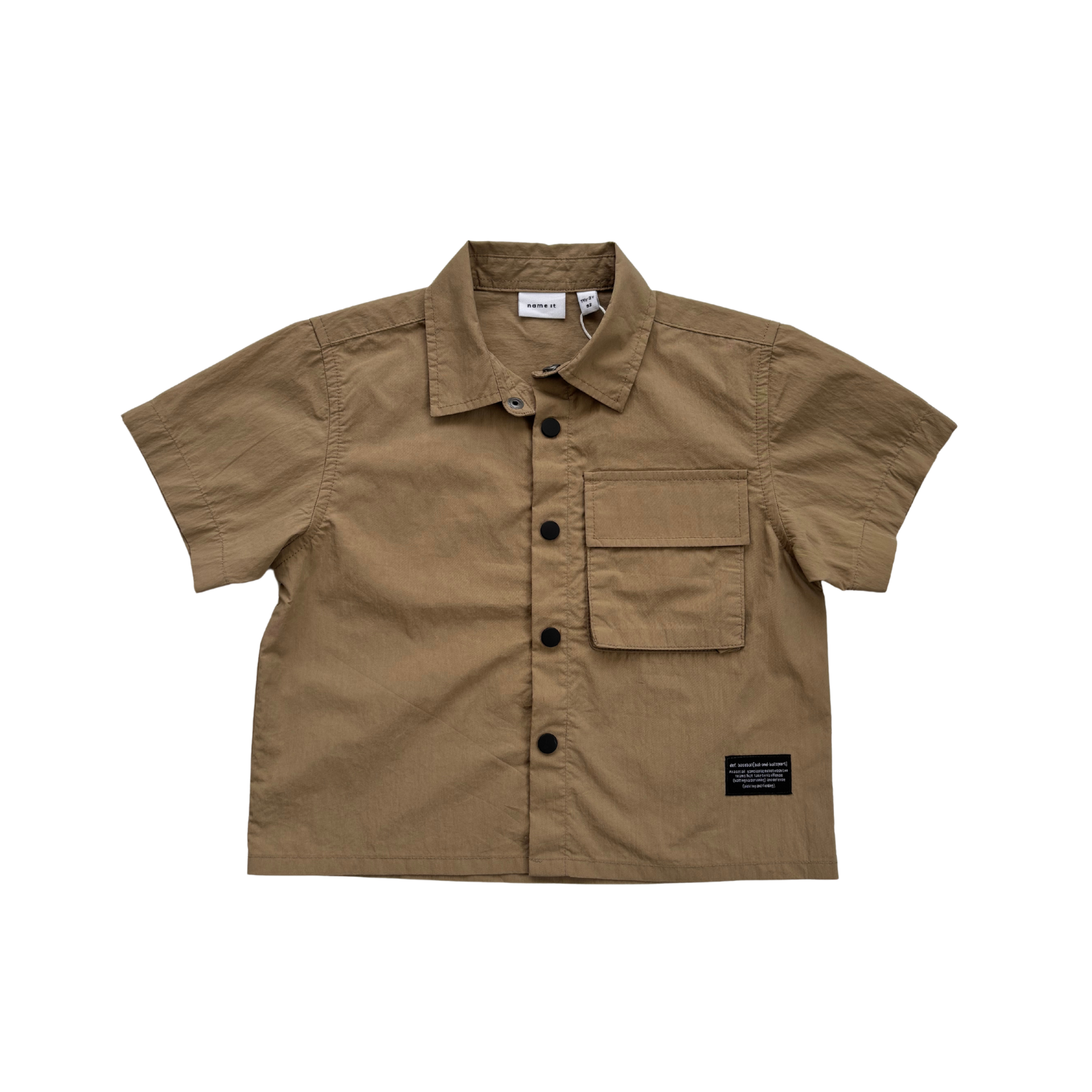 Brūns krekls ar spiedpogām. Brīvs piegriezums ērtām kustībām.
