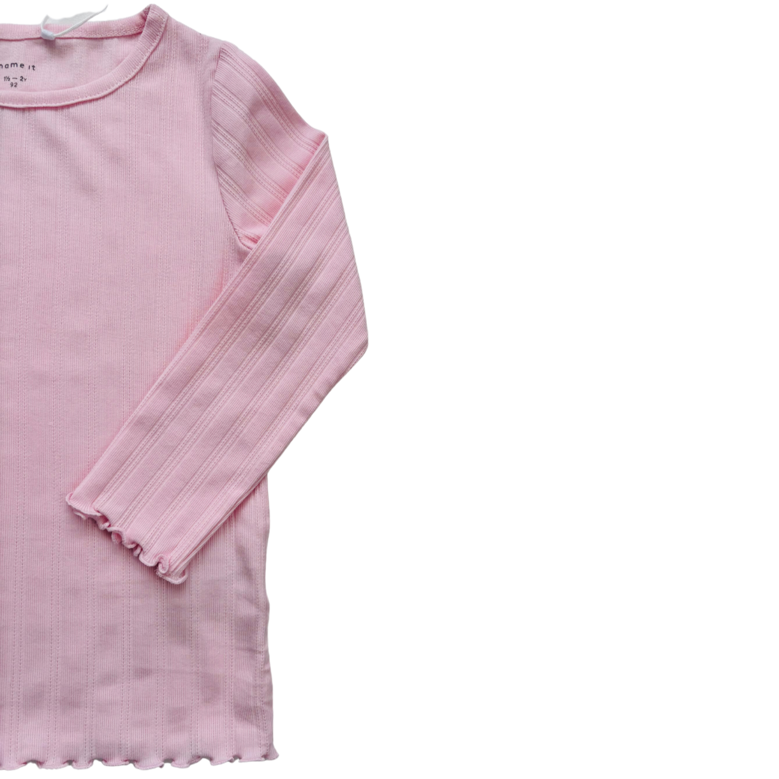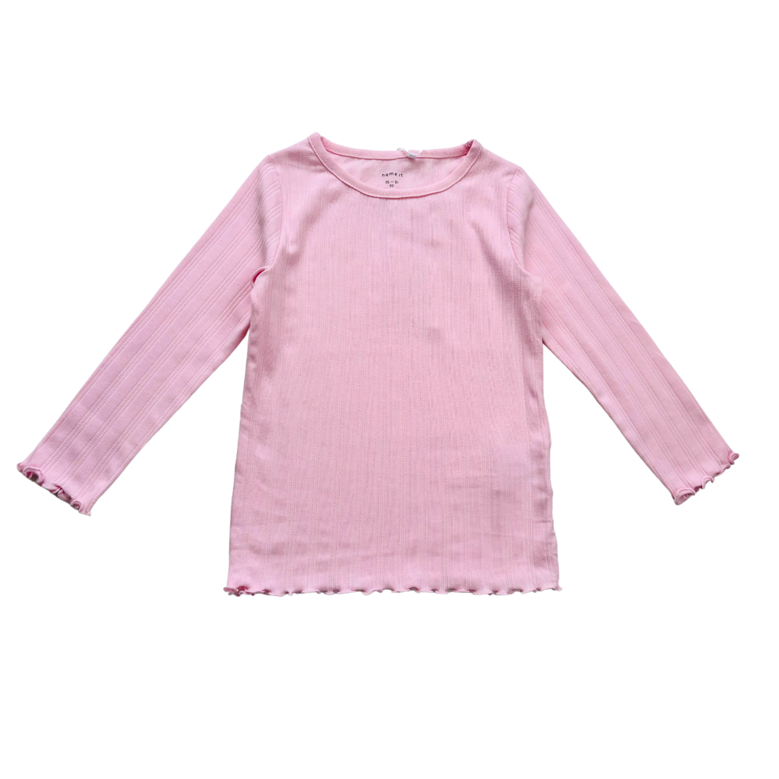 Gaiši rozā garroku krekls. Audumam ribbed struktūra. Kruzuļaina apakšmala un piedurkņu gali.