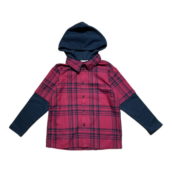 Name it garroku krekls bordo sarkans ar melnām rūtīm, tumšas vidēji bieza auduma piedurknes un kapuce.